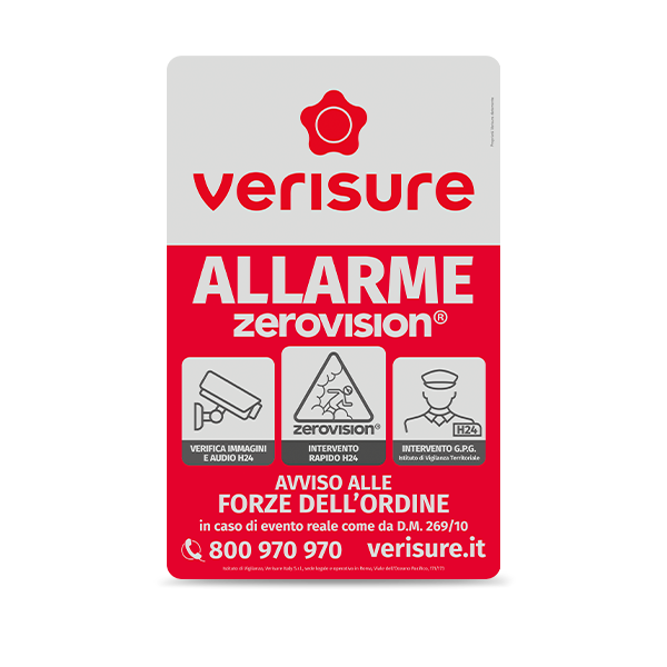 Ogni Cartello Verisure ha la funzione di informare riguardo le caratteristiche di protezione dell’allarme ad Alta Sicurezza Verisure, ovvero la verifica per immagini e audio, allerta ai Servizi di Vigilanza, intervento in loco con il fumogeno ZeroVision® e l'invio di Guardie Giurate Territoriali.