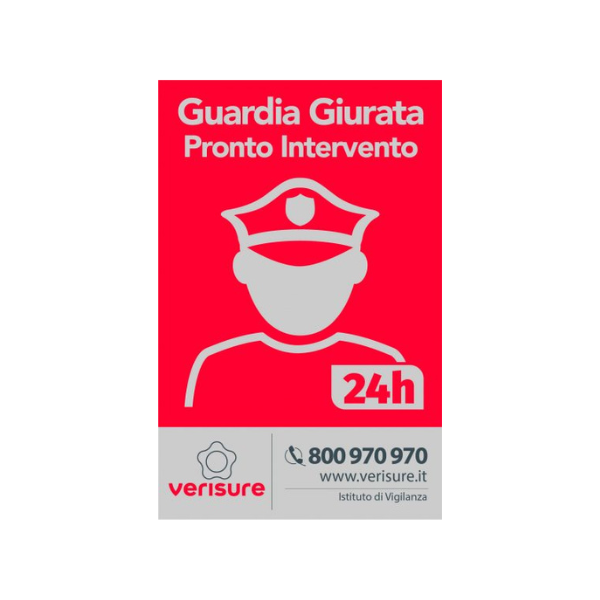 Di dimensioni ridotte rispetto al principale, questo cartello dissuasore informa il malintenzionato dell’attività di sorveglianza H24 della Centrale Operativa Verisure e dell’intervento tempestivo in loco di Guardie Giurate.