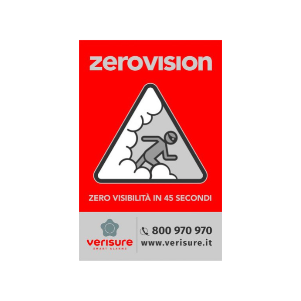 È il cartello informativo dell’allarme ZeroVision. Più piccolo del principale, allerta il malintenzionato della presenza di un allarme di tipo fumogeno all’interno dell’immobile/attività commerciale.