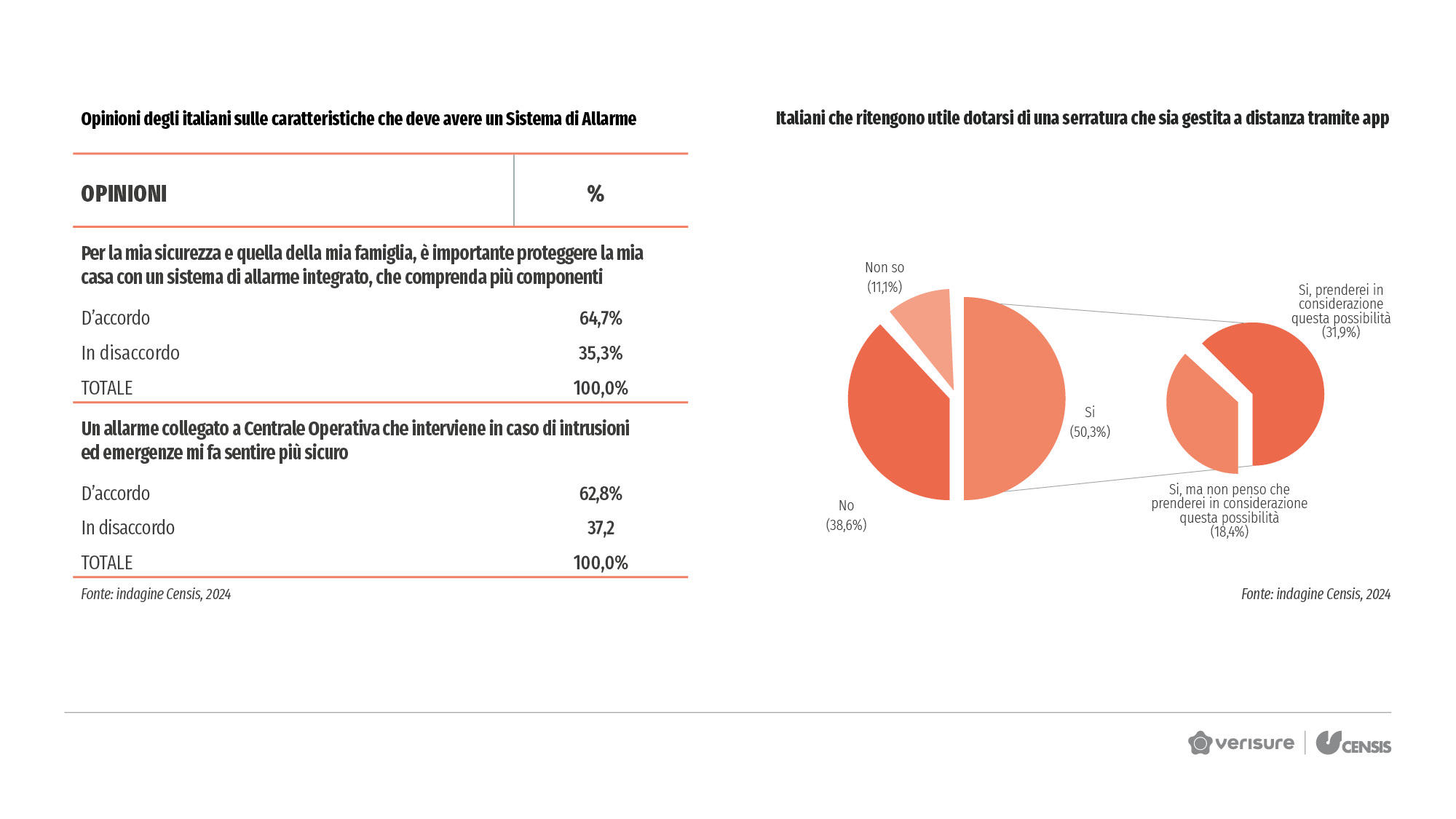 Circa 14 milioni e mezzo di italiani, il 28,6% del totale, nella loro vita hanno subìto almeno un furto in casa. L’88,8% degli italiani ritiene che la sicurezza sia una sfida collettiva cui contribuiscono lo Stato, le aziende private e i cittadini, l’88,9% ha almeno un dispositivo a protezione dell’abitazione e il 64,1% in futuro pensa di investire di più nella sicurezza domestica.